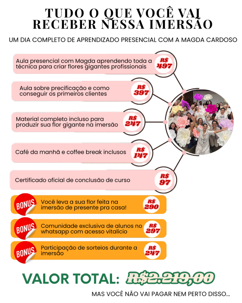 Além da parte prática, você terá uma aula exclusiva sobre precificação, posicionamento e como conseguir seus primeiros clientes no mercado das flores gigantes.